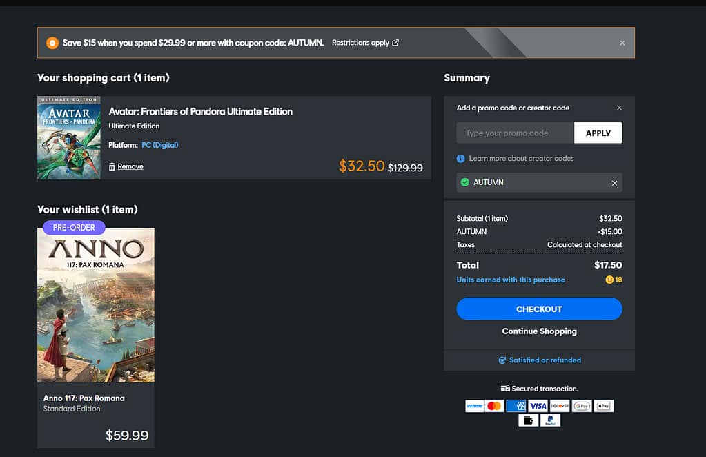 Por ejemplo, la Ultimate Edition de Avatar: Frontiers of Pandora, que normalmente cuesta $129.99, con el 75% de descuento se reduce a $32.50. Si antes de pagar aplican el cupón AUTUMN, el precio final baja a tan solo $17.50 más impuestos. ¡Es una oferta que no se pueden perder!