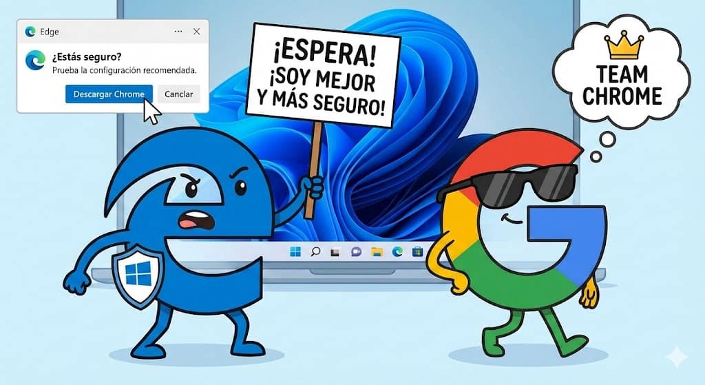 • El aviso al descargar Chrome: Si entras a bajar Chrome, Edge te lanza un banner enorme diciendo: “¡No hay necesidad de descargar un nuevo navegador! Ya tienes la misma tecnología aquí con la confianza de Microsoft”. Te hablan de una supuesta “seguridad superior” para que te lo pienses dos veces.
